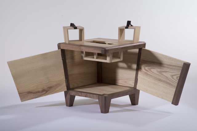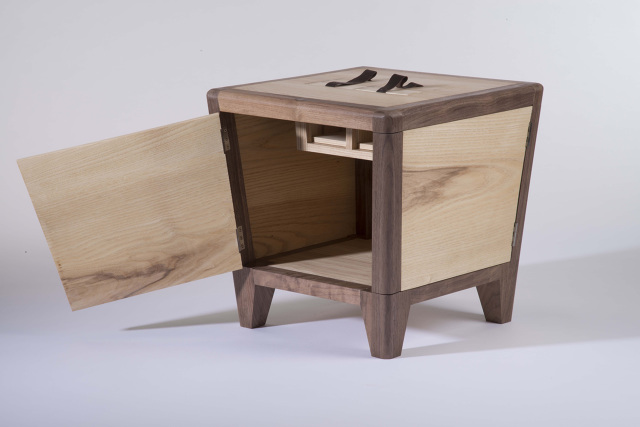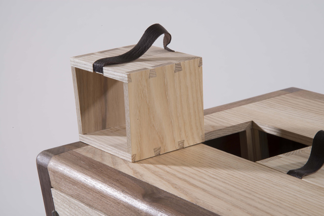 cabinet intended to store linens and lemons to freshenwalnut, ash, leather, brass and steel hardware15 x 15 x 15 in2012